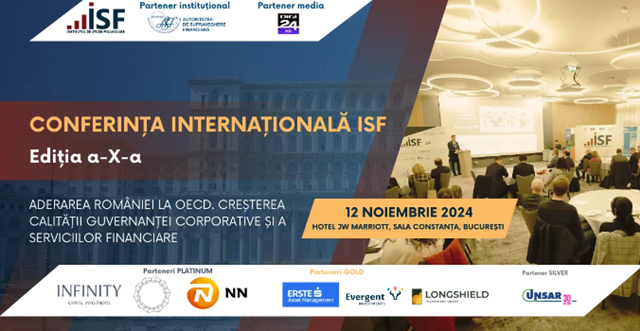 Cu acest prilej, Institutul de Studii Financiare organizează cea de-a X-a ediţie a Conferinței Internaționale ISF 2024 – Aderarea României la OECD. Creșterea Calității Guvernanței Corporative și a Serviciilor Financiare. Evenimentul din acest an este organizat la Hotel Marriott, sala Constanţa, în data de 12 noiembrie 2024, începând cu ora 10:00.
