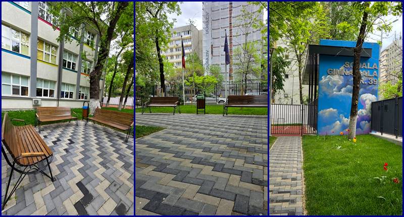 Curtea Școlii Gimnaziale nr. 39 a fost transformată complet, într-un loc plin de verdeață, cu bănci moderne, alei curate și zone de relaxare pentru elevi.